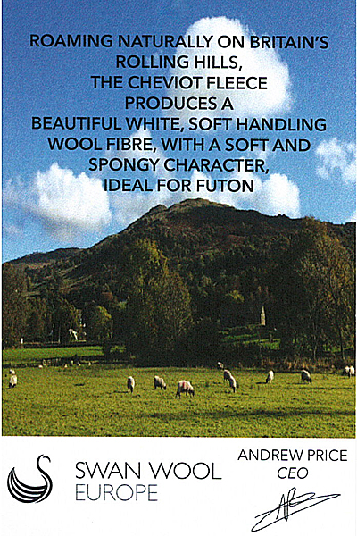 英国のなだらかな丘陵地帯で飼育されているチェビオット羊の毛は、美しい白さと柔らかな手触りを持つウール繊維を生み出します。柔らかく適度な弾力性はスポンジの様な質感で、敷き布団に適しています