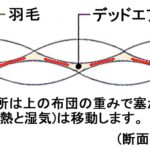 羽毛布団内部の熱は上方に移動しやすく、体周辺だけに局所的に温度が偏りがちです。しかし、2枚の布団の間にできた空気層(デッドエアーゾーン)が熱を水平方向にも広げることで、羽毛布団全体がやわらかな温かさを蓄えます。これにより、過度な熱や湿気をやさしく調整し、快適な睡眠環境を維持。まるで雲に包まれるような心地よい寝心地を実現。