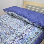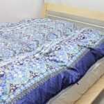 ダブルフェイスキルトは、特性の異なる2枚の布団を外周部の縫合と内面の数カ所を紐で接続して1枚に仕立てた構造です。職人による手作りで丁寧に仕上げられています。